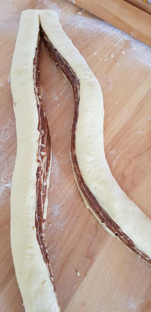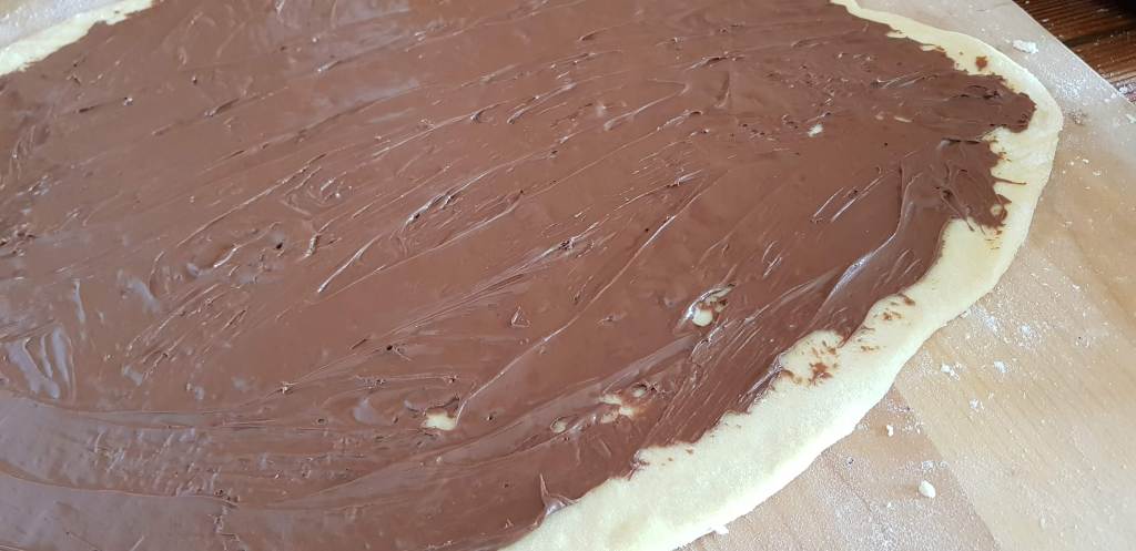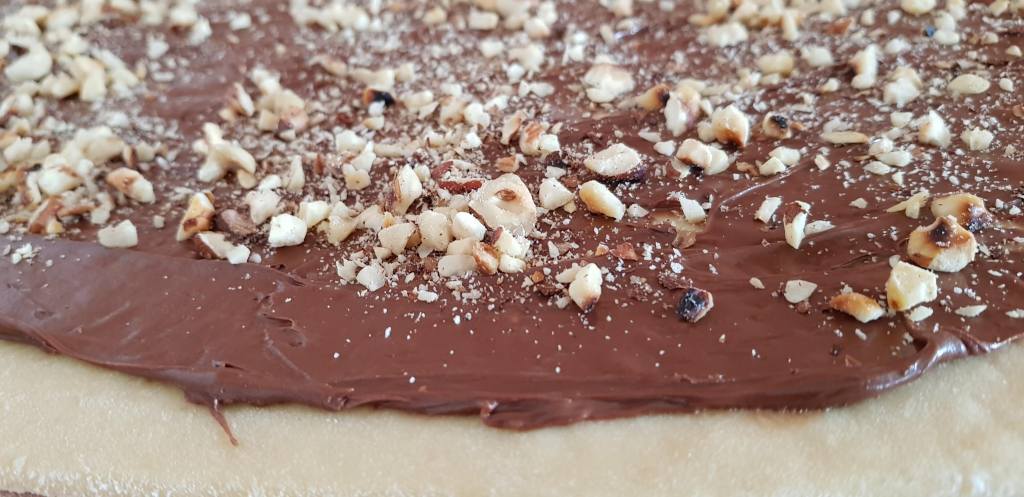 Na pobrašnjenoj podlozi razvaljajte tijesto. Ukoliko želite manje babke, podijelite ga na 2 ili 3 dijela. Tijesto razvaljajte da dobijete dugački i uski pravokutnik, kao za povitice, orehnjače ili makovnjače. Tijesto premažite čokoladnim namazom (malo ga ugrijte da se lakše maže) ili čokoladom koju ste otopili na pari sa slatkim vrhnjem te malo prohladili. Pospite krupno sjeckanim prženim lješnjacima.