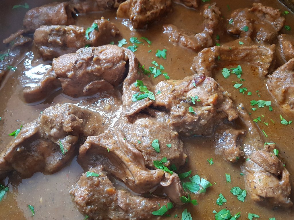 Zalijte temeljcem, dodajte malo vina i vode da meso bude potpuno pokriveno, poklopite i ostavite da lagano krčka. Nakon sat vremena izvadite meso, uklonite list lovora i klinčiće, a umak propasirajte. Koristim štapni mikser. Kušajte umak i dodajte sol i papar. Ako volite pikantno, možete dodati i malo ljutine. Dodajte sok od rajčice i malo muškatnog orašćića. Vratite meso u umak i ostavite da krčka još 30-ak minuta. Prije poslušivanja pospite peršinovim listom.