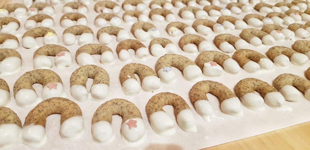 Zagrijte pećnicu na 180 stupnjeva. Roščiće slažite na lim obložen papirom za pečenje. Pecite ih 15-ak minuta dok blago ne porumene. Ohlađene roščiće ukrasite glazurom od bijele čokolade.