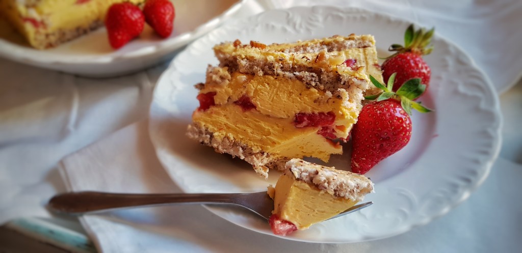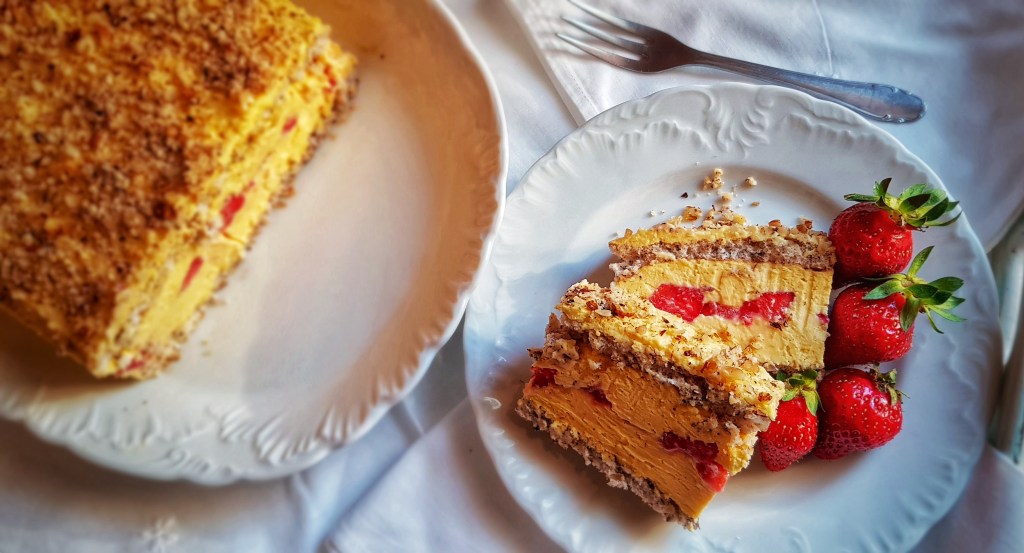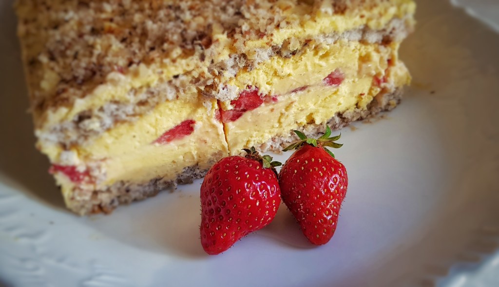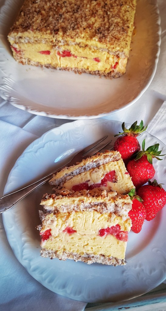 Planirala sam napisati neki slani recept, no ovih dana nam se jede meso s roštilja pa smo većinom u vrtu i ne pripremam neka posebna jela. Stoga sam odlučila da Gorski kotao bude još malo slađi i eto recepta za kolač. U posljednje vrijeme češće pripremam slastice s voćem pa je ovo još jednan kolač s jagodama jer su ove sezone posebno slatke i mirisne. Moram priznati da volim jesti kolače i od prejedanja slatkim me spašava samo to što ih još više volim pripremati pa mi je dovoljno samo da kušam što sam pripremila. Kolače gotovo uvijek podijelim obitelji i prijateljima pa mislim da je to dio čarolije slatkog jer razveselim nekoga i zasladim mu dan. U ovoj kombinaciji s koricama od lješnjaka i kremom od jaja i vanilije jagode su dale dozu svježine i sve skupa je baš odličnog okusa.