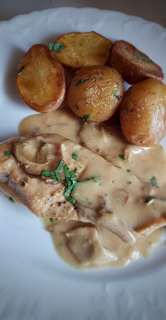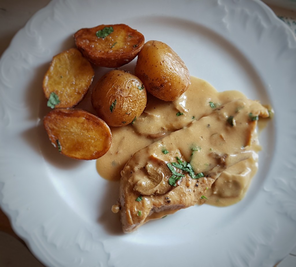 Pileća prsa su dio piletine koji se vrlo lako presuši kod pripreme. Često ga paniramo ili pečemo na roštilju, ali meni su najdraža ovako, začinjena, kratko pečena s obje strane pa s nekim finim umakom koji čuva sočnost. Na ovaj način možete pripremiti i pureća prsa, teleće , svinjske ili juneće odreske pa samo prilagoditi duljinu termičke obrade mesa. Pošto je sezona mladog krumpira, uz ovo jelo sam poslužila domaći, sitni, crveni, mladi krumpir pripremljen na masti.