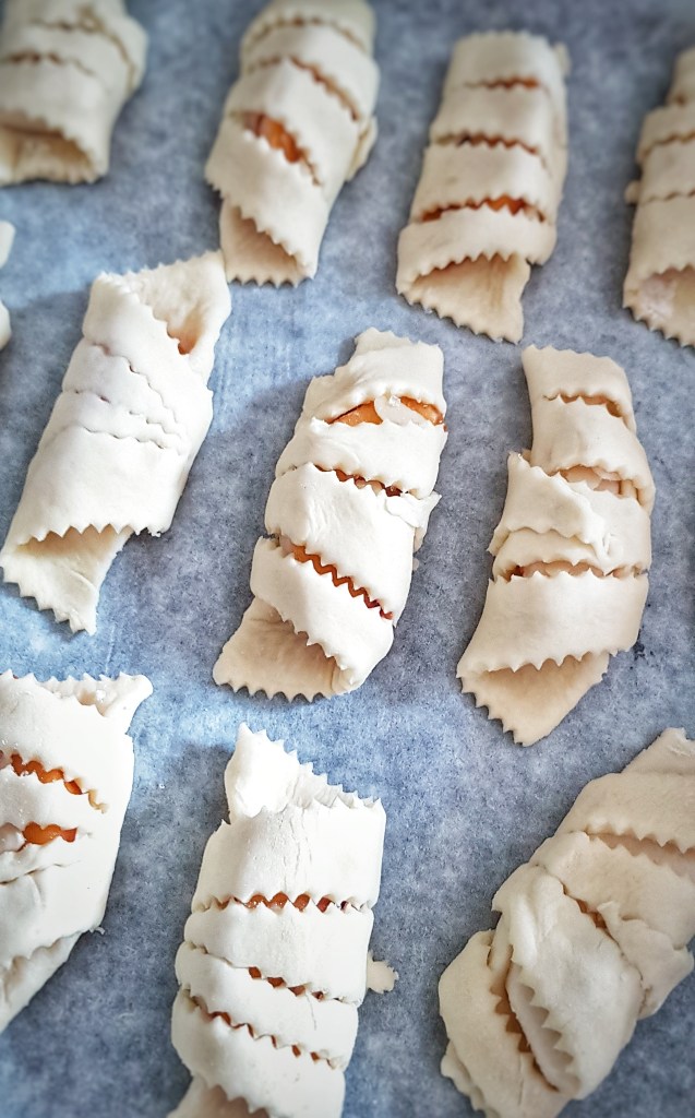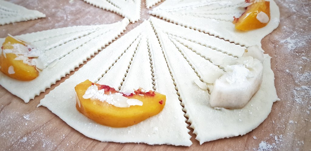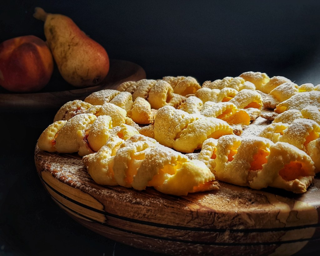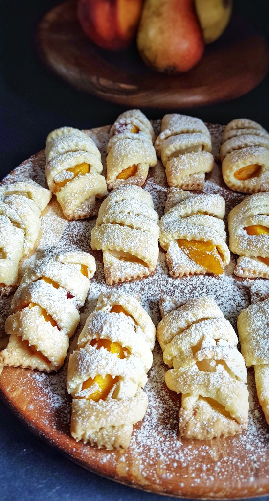 Ljeto je u punom zamahu, kolovoz je vruć i u Gorskom kotaru, ali su noći ugodne, zvjezdane i svježe pa se lijepo spava. Ličanki koja je odrasla u Gorskom kotaru ove vrućine nisu prijatelj, ne osjećam se ugodno pa tako i u kuhinji izbjegavam paljenje pećnice osim ako nemam jako dobar razlog za to. No baš volim kolovoz jer su u tom mjesecu rođendani mog brata i moje majke i jer beremo plodove u našem povrtnjaku i voćnjaku. Upravo to obilje voća koje nam je dostupno u ovim mjesecima neka vam posluži kao inspiracija za ove kolačiće. Možete ih napuniti nekim omiljenim voćem, breskvama, kruškama, jabukama, šljivama… Bitno je da je voće krupnije jer se radi o komadu voća umotanom u prekrasno prozračno i lagano tijesto. Kolačići su brzo gotovi, a potrebno vam je samo malo vještine kod izrezivanja i motanja.