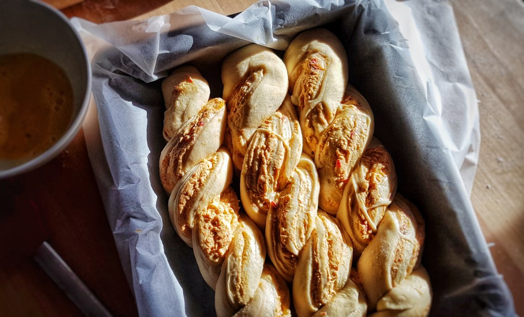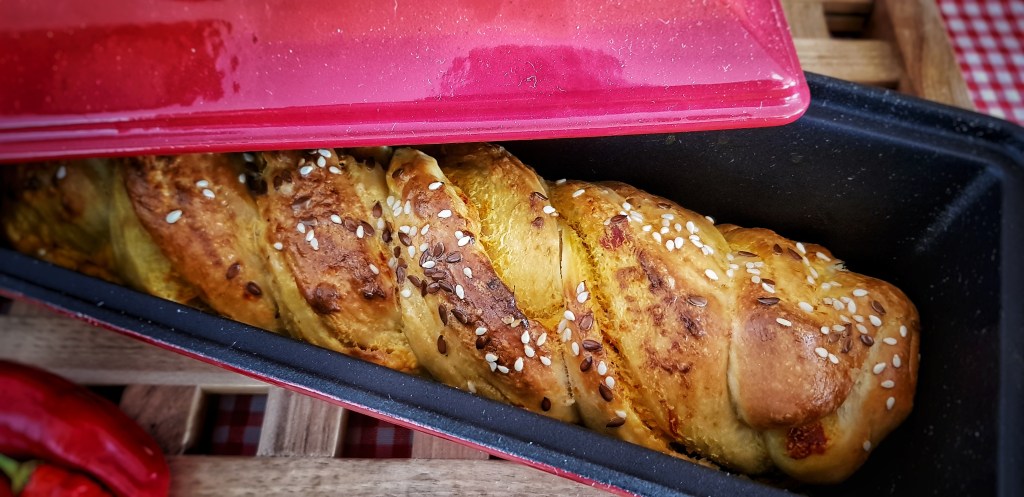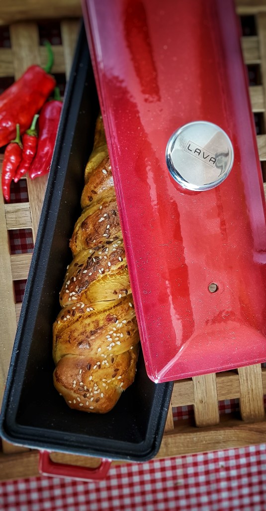Prekrasna, šarena i topla jesen pomalo donosi mraz te hladnije dane. Sve više smo u kući i sve češće ložimo, Tako i u kuhinji sve češće palim pećnicu jer je topla kuća idealna za pripremu dizanog tijesta. Volim dizano tijesto jer zahtijeva vrijeme i neke korake u postupku pripreme koji traže strpljenje, ali su zato miris, okus i tekstura prava nagrada za nepce. Osim standardnog kruha, u posljednje vrijeme se me osvojile ovakve pletenice u stilu babke koje se mogu pripremati sa brioche tijestom u slatkoj, ali i ovako, u slanoj varijanti. Pečenje mi olakšava i novi pekač od lijevanog željeza u omiljenoj boji (Lonci i poklopci) pa sam se baš razveselila ovom pletenicom nadjevenom krem sirom, ajvarom i čili umakom (znate već, ja i ljutina zaljubljeni par).
