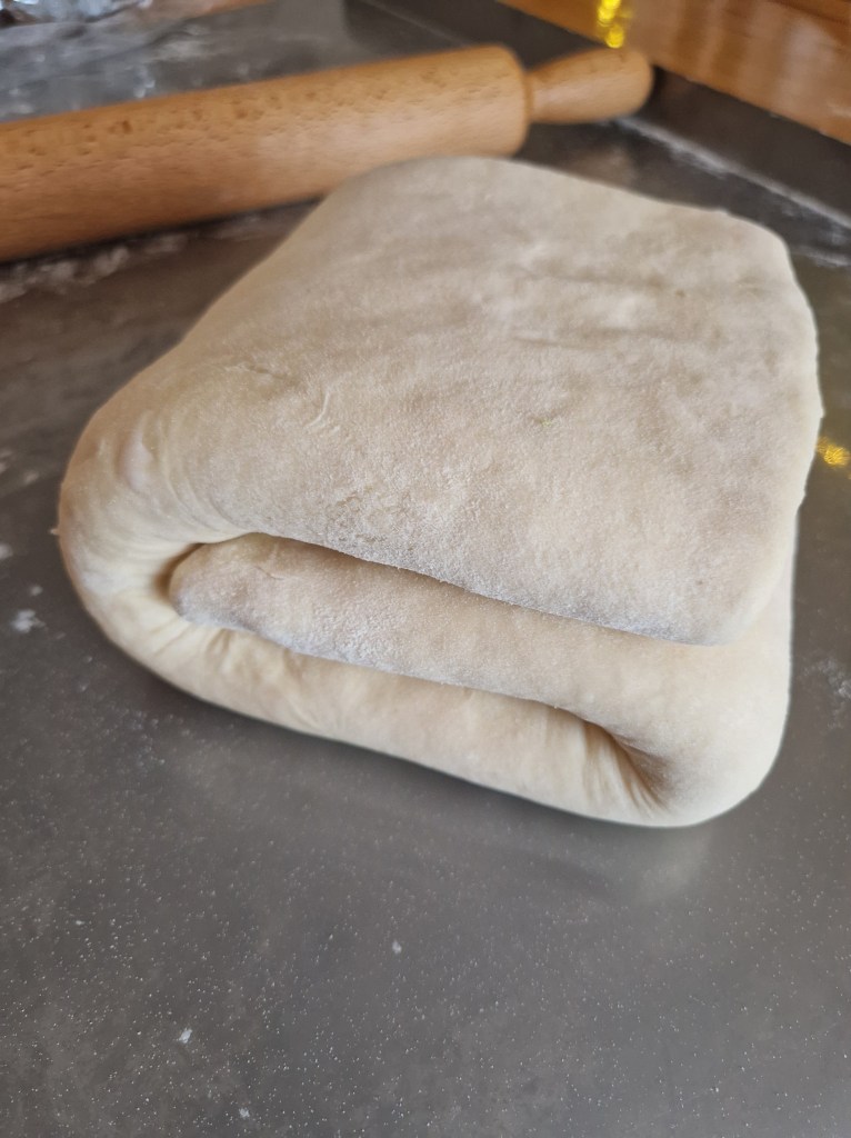 Na pobrašnjenoj podlozi rastanjite tijesto valjkom te premažite četvrtinom sala. Preklopite tijesto vodoravno do pola pa drugu polovicu preko toga. Isto ponovite i okomito. Zamotajte ga u prozirnu foliju i stavite u zamrzivač na 20 do 30 min. To valjanje i premazivanje pa preklapanje ponovite još 3 puta.. Tako pripremljeno tijesto zamotajte u prozirnu foliju i spremite u hladnjak do idućeg dana.