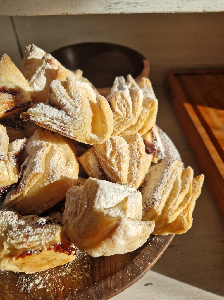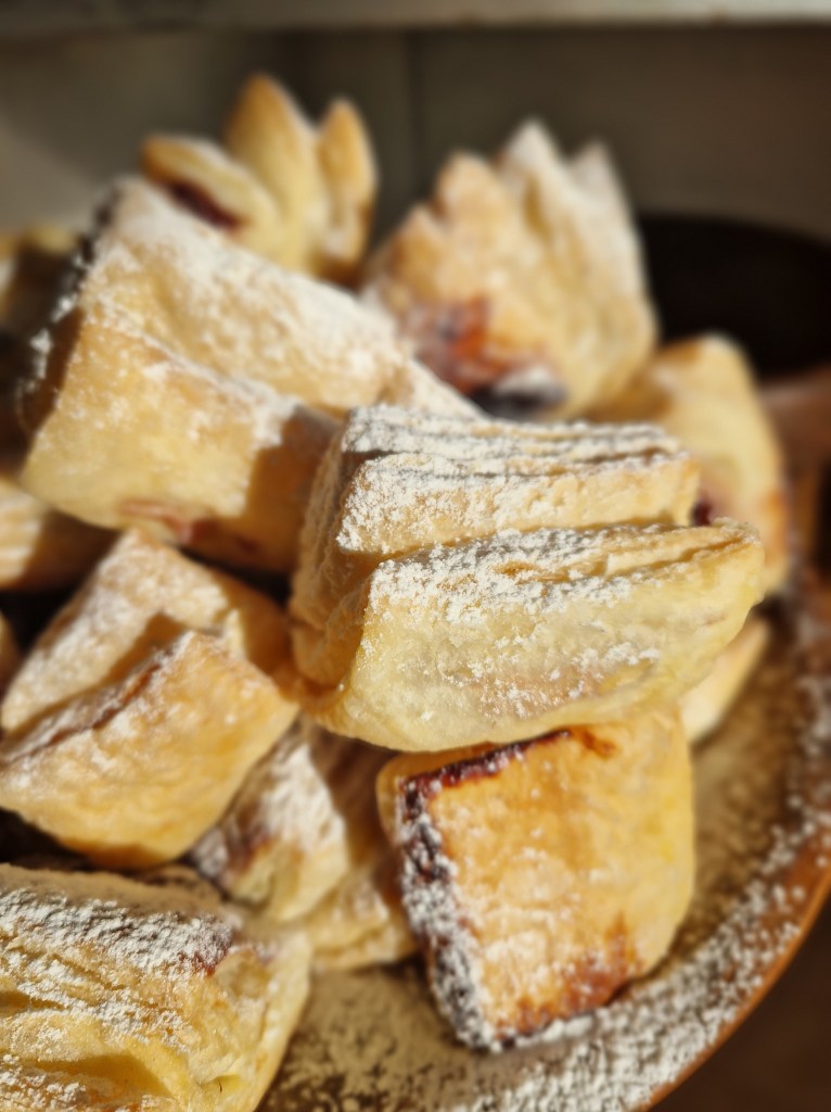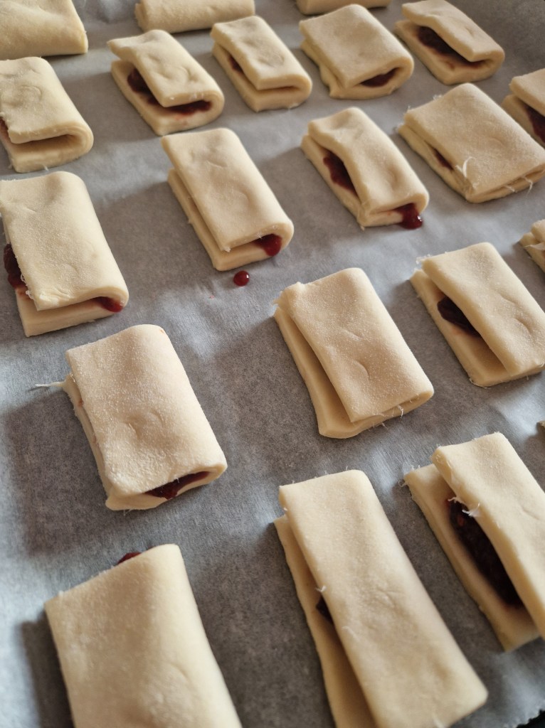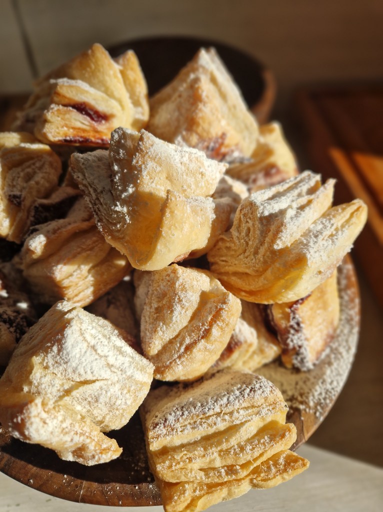 Idući dan rastanjite tijesto valjkom da dobijete četverokut debljine oko pola centimetra. Izrežite na četverokute te na svaki stavite pola žličice čvršćeg pekmeza. Preklopite po želji, kao knjigu, suprotne krajeve po sredini ili u trokut pa dva suprotna kuta stisnite. Poslažite na lim obložen papirom za pečenje i pecite u zagrijanoj pećnici na 175 do 180 stupnjeva dok ne porumene. Dok su mlaki pospite šećerom u prahu i uživajte u hrskavim i prozračnim zalogajima.
