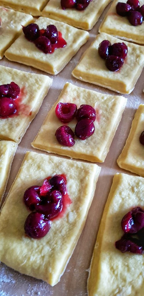 Razvaljano tijesto režite na četverokute i na svaki stavite višnje. Višnje neka budu ocijeđene da vam se ne razlije višak soka. Svaki četverokut zamotajte u kuglu (buhtlu). Dobro zalijepite krajeve i kod slaganja, to je donja strana. Buhtle slažite u namašćenu tepsiju na papir za pečenje (ja sam pekla u okrugloj gusanoj tavi).