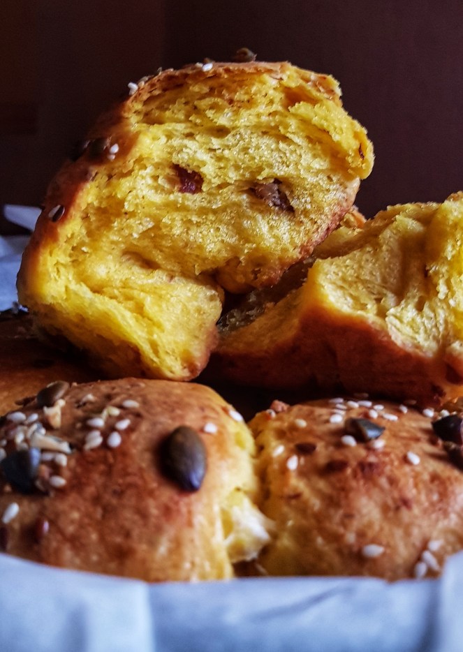 Za pripremu ovih buhtli koristila sam pire od pečene hokaido tikve koja je slatkasta. Možete koristiti i muškatnu ili bilo koju drugu bundevu. Pire od pečene bundeve je gust i s manje tekućine pa će vam za pripremu ovakvog tijesta trebati više vremena za dizanje tijesta. Pošto od nedavno imam novu pećnicu, izvrsno mi posluži opcija na 30 stupnjeva da ubrzam postupak dizanja. Ukoliko niste ljubitelj čvaraka, u tijesto možete dodati poprženi, hrskavi špek ili ih samo napuniti slanim sirom ili šunkom.