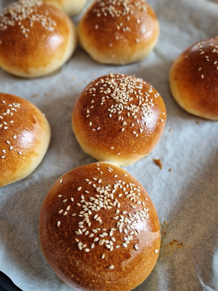 Ujutro oblikujte kuglice (vagala sam komadiće tijesta i moje su cca 125 do 130 g svaka), zategnite ih da površina bude glatka i slažite na lim obložen papirom za pečenje. Prekrijte prozirnom folijom i stavite na toplo dok se ne udvostruče. To će trajati opet nekoliko sati ovisno o temperaturi. Najbolje mi se pokazalo kada ih stavim u pećnicu na 30 stupnjeva. Ovo dizanje tada traje otprilike 3 sata. Kada su se udvostručila, peciva premažite umućenim jajetom i pospite sezamom. Pecite 15 do 20 min na 220 stupnjeva.