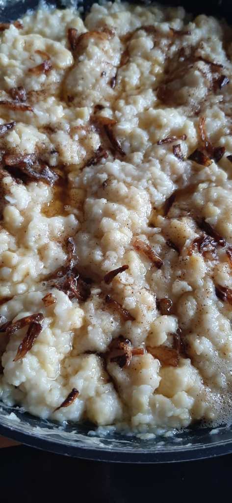 Evo i recepta za to jednostavno jelo koje je nekada bilo glavni doručak u selu. Upravo zato mislim da zaslužuje da se negdje zapiše i ne zaboravi. Napraviti tijesto za savijaču, na tavi zagrijati mast u kojoj ćemo lagano miješajući zapeći jaja, posoliti, popapriti te ih ohladiti. Razvući tijesto, posipati s jajima, zarolati i ispeći u pećnici.