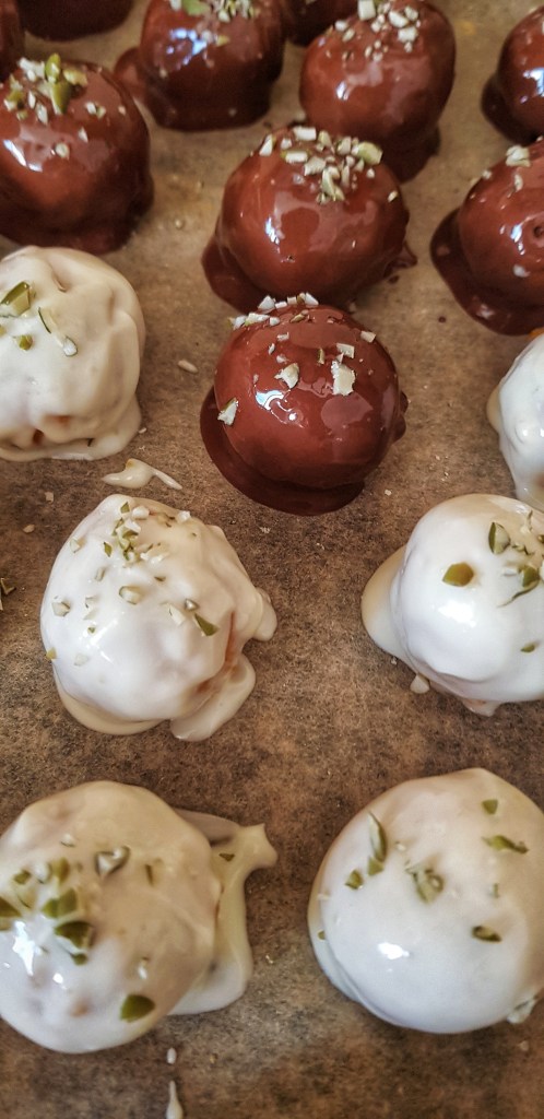 Za umakanje okruglica otopite čokoladu na paru uz dodatak 2 žlice ulja. Svaku okruglicu uz pomoć viljuške umočite u toplu čokoladu i slažite na rešetku ili masni papir. Obično napravim obje verzije, tamnu i bijelu čokoladu, a možete ih i samo uvaljati u kakao prah, kristal šećer ili mljeveni keks, orahe ili bučine sjemenke.