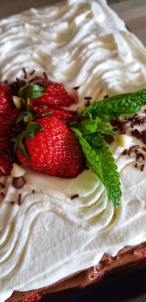 Umutite slatko vrhnje sa šećerom u prahu da dobijete čvrst šlag. Ukrasite kolač te posložite nekoliko lijepih jagoda i dodajte par listića mente ili matičnjaka. Možete još posuti i čokoladnim strugotinama.