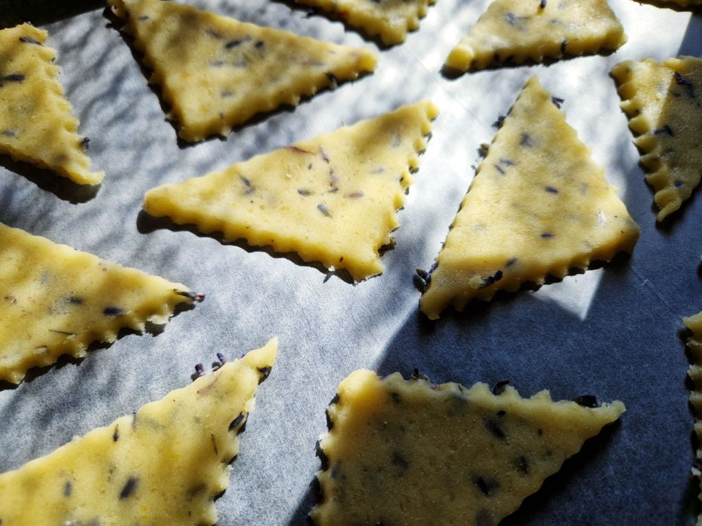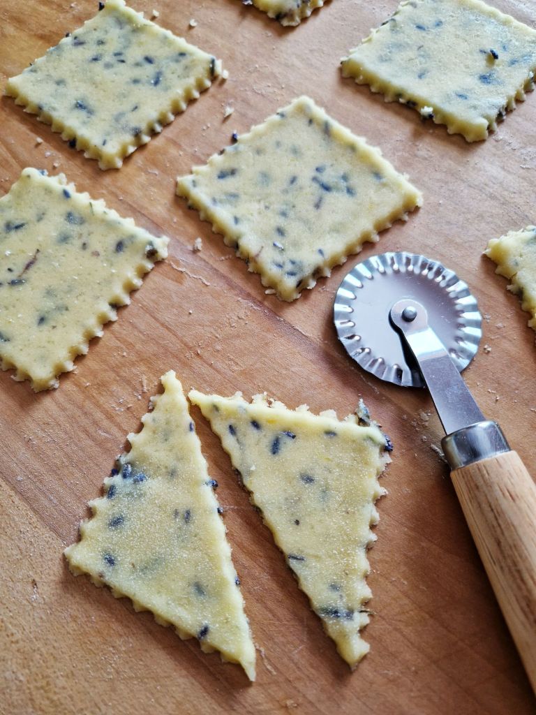 Maslac izvadite iz hladnjaka nekoliko sati ranije da skroz omekša. Cvjetove lavande dodajte omekšalom maslacu i miksajte dok ne bude fino pjenasto. Dodajte šećer u prahu i malo soli pa opet miksajte. Dodajte jaje, brašno i limunovu koricu pa umijesite tijesto. Ukoliko je potrebno, dodajte još malo brašna ili ako je pretvrdo, možete dodati žlicu hladne vode. Zamotajte ga u prozirnu foliju, stanjite kao deblju palačinku i stavite hladiti.