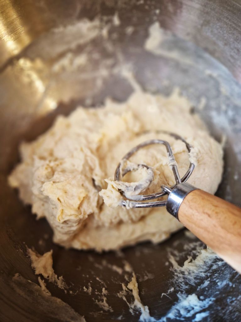 Najprije pomiješajte brašno i vodu da dobijete meko tijesto koje ne treba biti glatko i izrađeno. Pokrijte da se ne stvara korica i ostavite da stoji sat vremena. Ta faza se naziva autoliza gdje se brašno otapa u vodi i oslobađa hranu za kvasce.