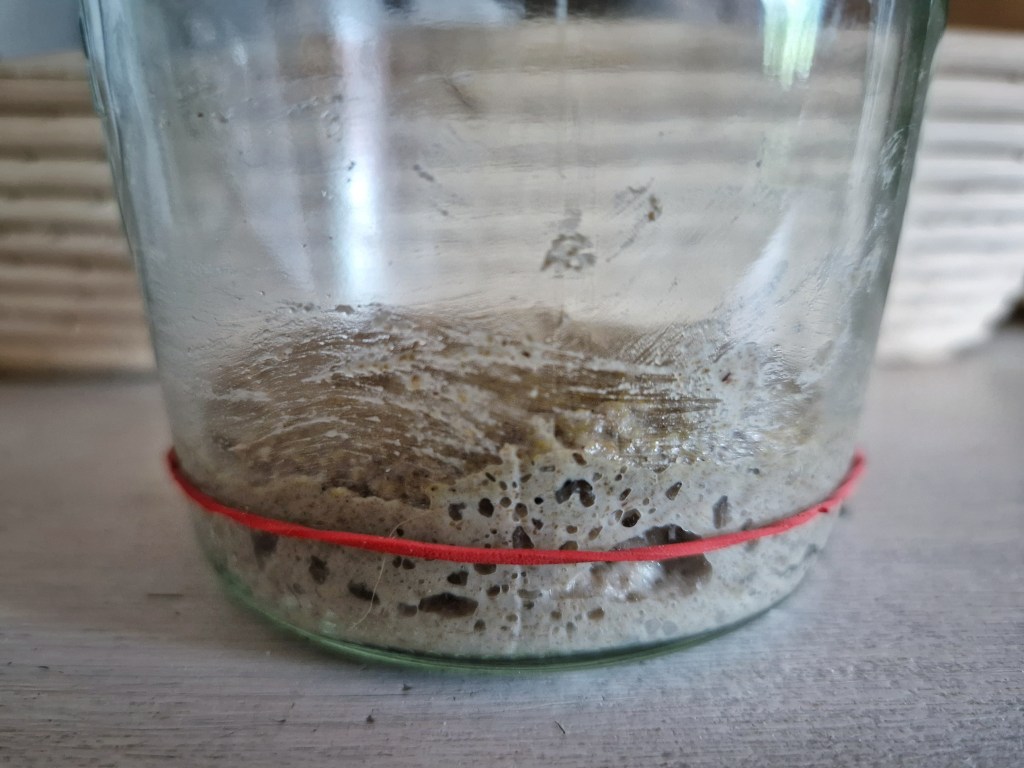 Sada su se dogodile neke promjene u smjesi i mozete primijetiti mjehuriće. To je znak da je vrijeme za sljedeći korak.U čistu staklenku stavite 30 g tog kvasca, 30 g vode i 30 g raženog brašna. Dobro promiješajte, provjerite da nema suhih ostataka brašna i poklopite staklenku. Ostavite da stoji negdje u kuhinji. Ostatak kvasca bacite, ali nikako u odvod! Može u komposter ili jednostavno u ubrus pa u otpad. U ovoj fazi taj višak bacamo jer još nije uspostavljena kolonija dobrih bakterija i kvasaca.