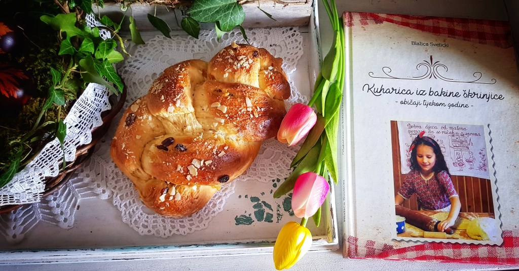 U Kuharici iz bakine škrinjice možete pronaći predivne recepte jela karakterističnih za Gorski kotar kao i priče o običajima i blagdanima kroz godinu. Zbog toga sam ove godine za Uskrs odlučila pripremiti slatki kruh/pogaču po receptu iz ove divne knjige. Slatki kruh ili pogača se po tradiciji nosio na blagoslov u košarici s ostalom hranom pripremljenom za Uskrs (nadjevom, šunkom, jajima, kruhom, solju…). No ovu pogaču možete pripremati kada vam se jede sladak i mirisan doručak, za popodnevnu kavu ili čaj ili jednostavno za neki slatki poklon jer je jako ukusna, meka i aromatična.