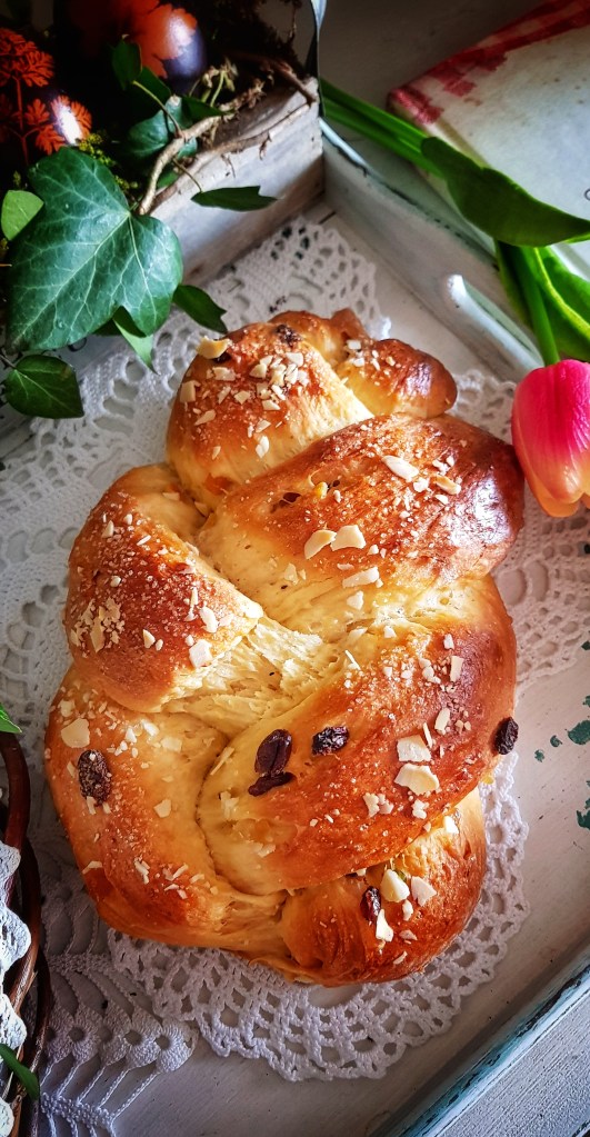 Slatki kruh me okusom podsjetio na kuglof što ga je pripremala moja baka, a koji je nadjevala pekmezom od šljiva te motala kao poviticu pa mi je priprema ove pogače izazvala ta slatka sjećanja na djetinjstvo. Ono što je zanimljivo, kao osoba koja ne podnosi grožđice, nisam mogla odoljeti ovom slatkom kruhu iako sadrži grožđice natopljene u rumu. Od ove količine sastojaka sam dobila 3 manje pogače i jednu pletenicu, a naravno, možete peći jednu veliku pogaču.