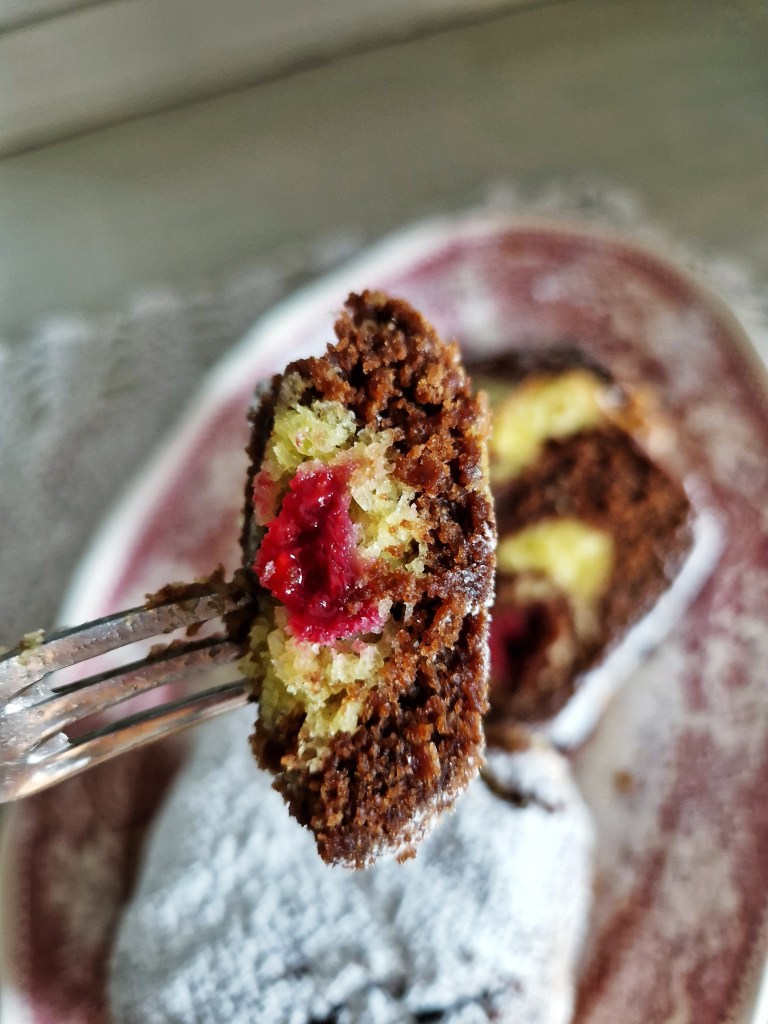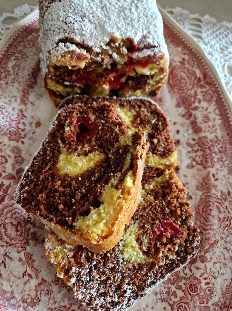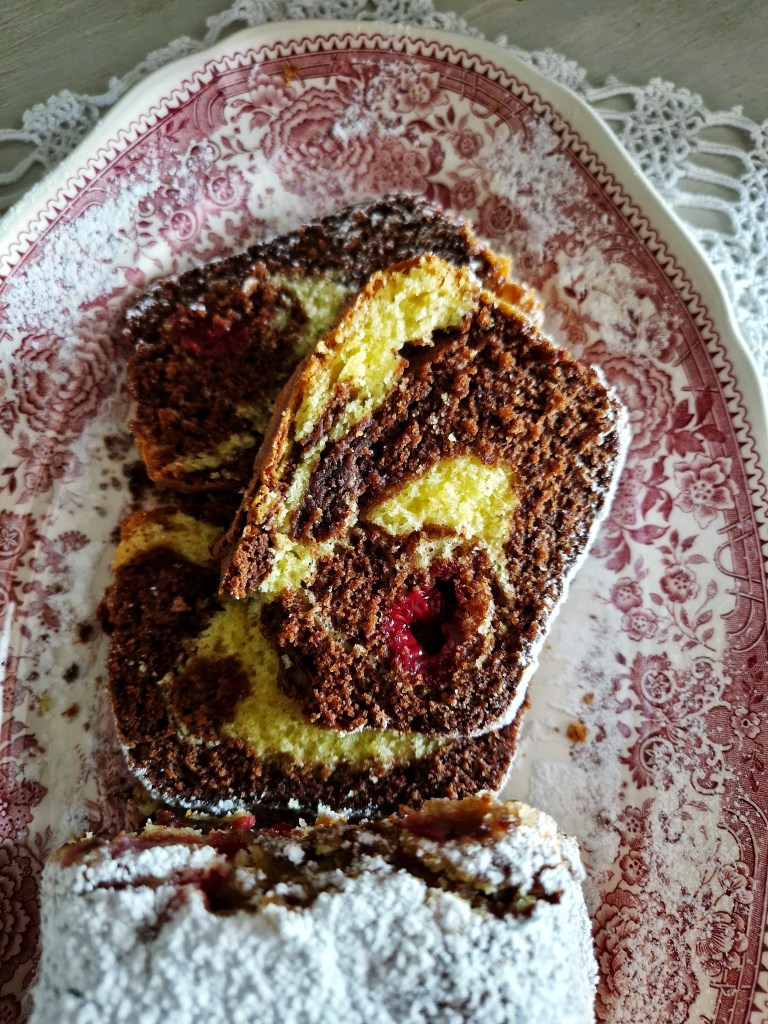 Nedavno sam opet, nakon duljeg vremena, prelistala stare bilježnice s receptima u potrazi za nekom idejom za nedjeljnu poslasticu. Za oko mi je zapeo recept pod nazivom Mramorni kolač napisan zelenom tintom i prekrasnim rukopisom. Odlučila sam ga isprobati i unutra ubaciti još i maline iz zamrzivača. Rezultat me oduševio jer kolač je predivno sočan, pun maslaca i čokolade, a maline su bile baš odličan dodatak.