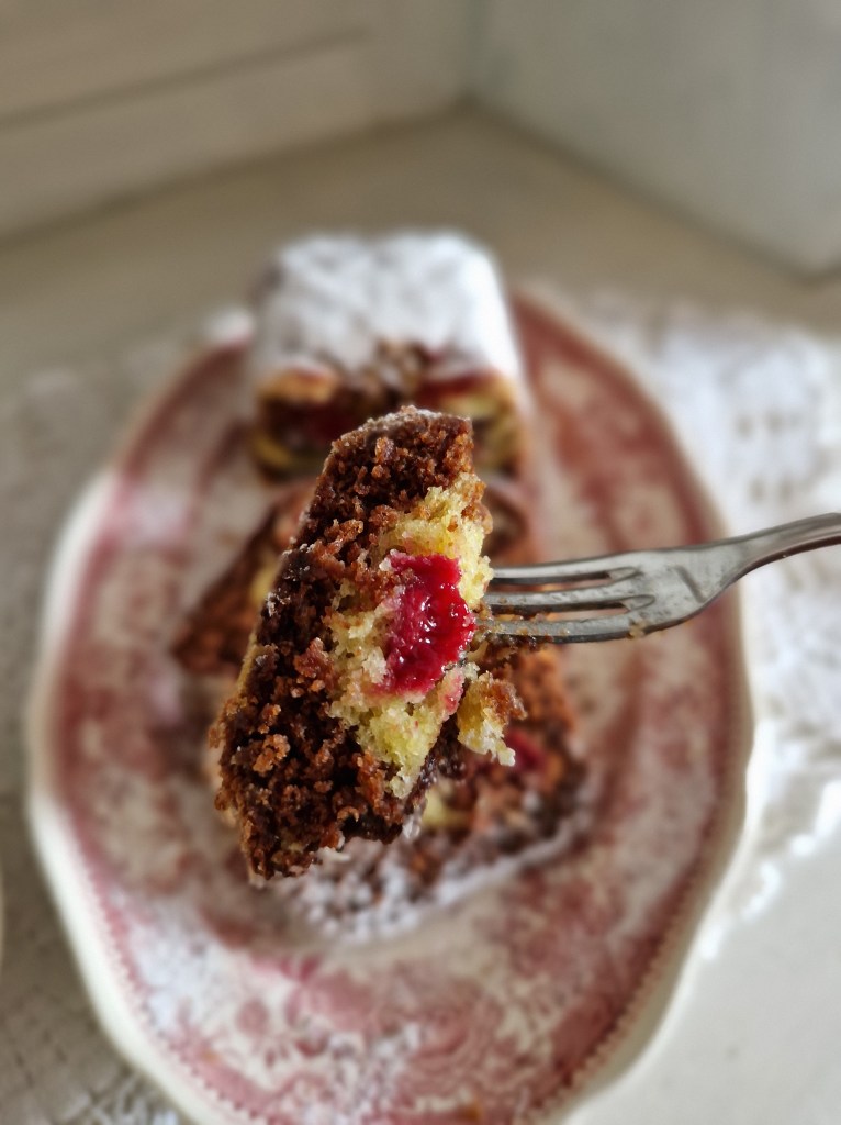 Kolač možete peći u duguljastom kalupu ili u manjem četvrtastom. Kalup namastite i pospite malo brašnom pa naizmjenično stavljajte tamnu i svijetlu smjesu. Ukoliko ćete dodavati maline ili neko drugo bobičasto voće, uvaljajte voće u šećer u prahu pa posložite po smjesi i drvenim štapićem malo gurnite da utone.