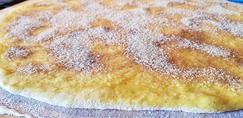 Kada je tijesto naraslo, premjestite ga na pobrašnjenu podlogu i premijesite. Dodajte brašna koliko treba da vam se ne lijepi za podlogu pa razvaljajte tijesto u pravokutan oblik dimenzija cca 30 x 40 cm, oko 1 cm debelo. Otopite maslac pa premažite preko tijesta. Pomiješajte smeđi šećer s cimetom i pospite preko tijesta. Čvrsto zamotajte tijesto u roladu. Režite kolutove (rolice) debljine otprilike 1,5 do 2 cm te ih slažite na namašćeni pleh obložen masnim papirom. Neka između rolica bude malo razmaka. Prekrijte prozirnom folijom te ostavite neka se diže još sat vremena (ja sam malo požurila pa nisu toliko narasle).