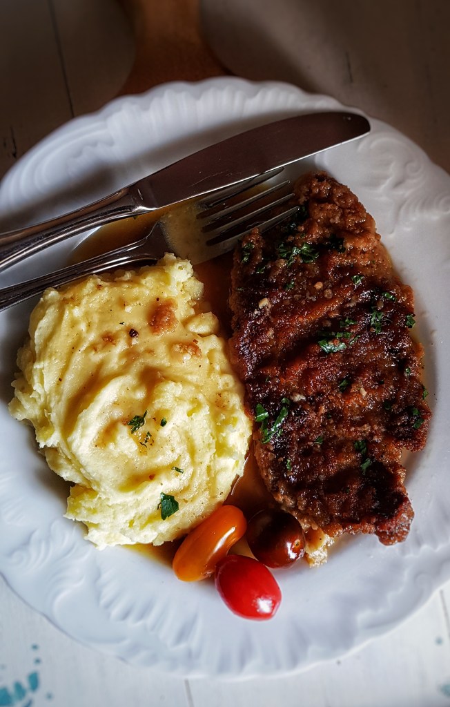 Za pripremu ovog jela trebate izdvojiti nešto vremena i malo vještine, ali vjerujte, isplatit će vam se. Nakon pohanja, šnicle se pirjaju u vinu i temeljcu, a to možete na dva načina, na štednjaku ili u pećnici. Meni su iz pećnice ukusnije. Ako pripremite veću količinu, možete ih jesti i idućeg dana . Tajna je da koristite dobro vino za podlijevanje te da mrvice prije pohanja odrezaka dobro ulupate u meso kako se ne bi odvajale kod pirjanja. Peršinov list i češnjak nadopunjuju aromu ovog jela, meso bude mekano i topi se u ustima, a smjesa pohanja zgusne umak. Nama najviše prijaju uz pire krumpir, no možete ih poslužiti s bilo kojim prilogom.