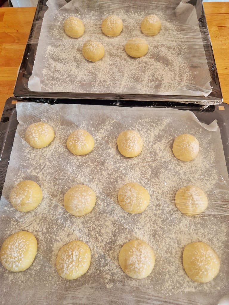 Nakon što se umiješeno tijesto digne, izvažite komadiće tijesta od nekih 65 do 70 g. Oblikujte kuglice koje stavite na pobrašnjenu podlogu, pospite s brašnom i prekrijte prozirnom folijom. Ostavite ih da se dižu još nekih dva sata. Idealno je kada dosegnu nekih 8 ili 9 cm u promjeru, tada su spremne za prženje.