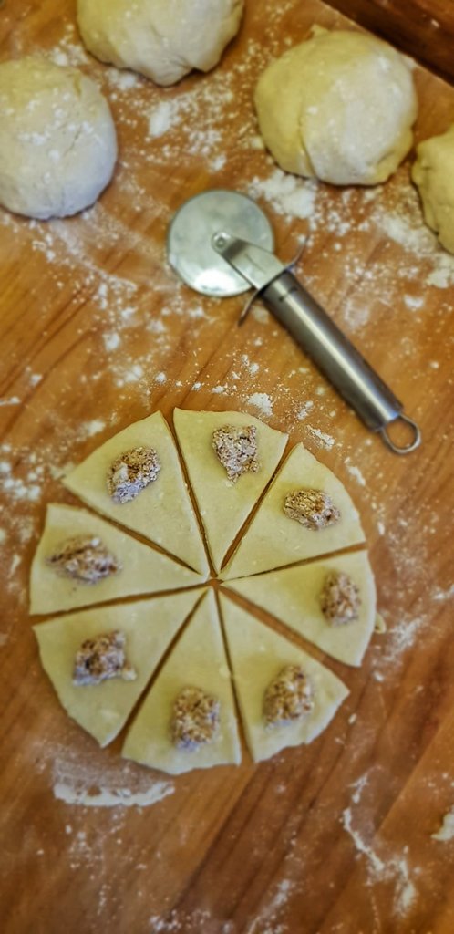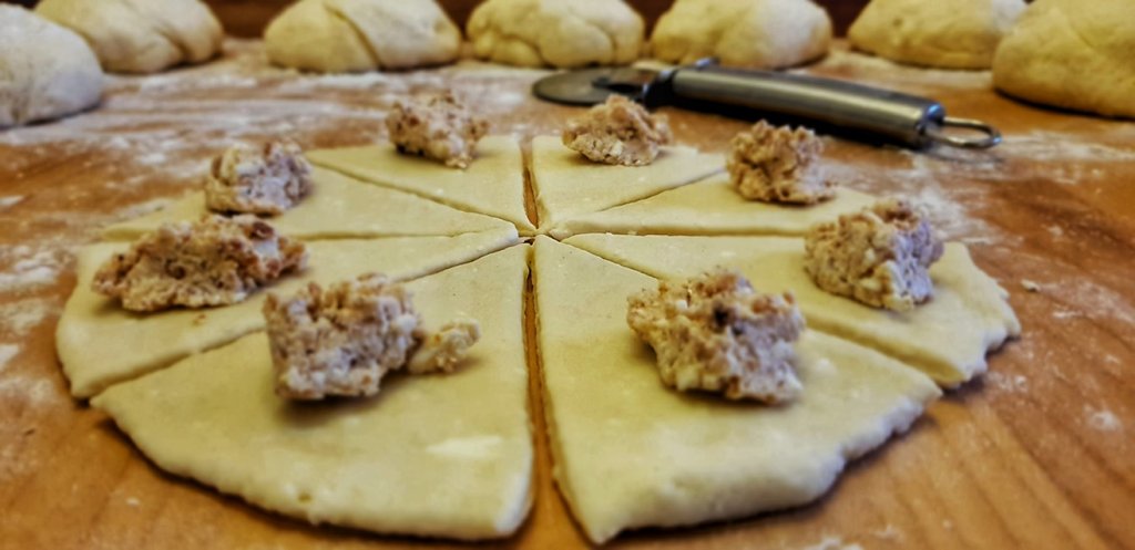 Pobrašnite podlogu za rad i svaku kuglu tijesta razvaljajte u krug te režite na osam dijelova, trokuta. Na svaki trokut (na širi dio trokuta) stavite punjenje od čvaraka i sira. Kiflice zarolajte od tog najšireg dijela prema špicu trokuta. Slažite ih u pleh od pećnice na masni papir. Neka vam spoj bude ispod.