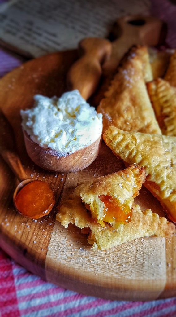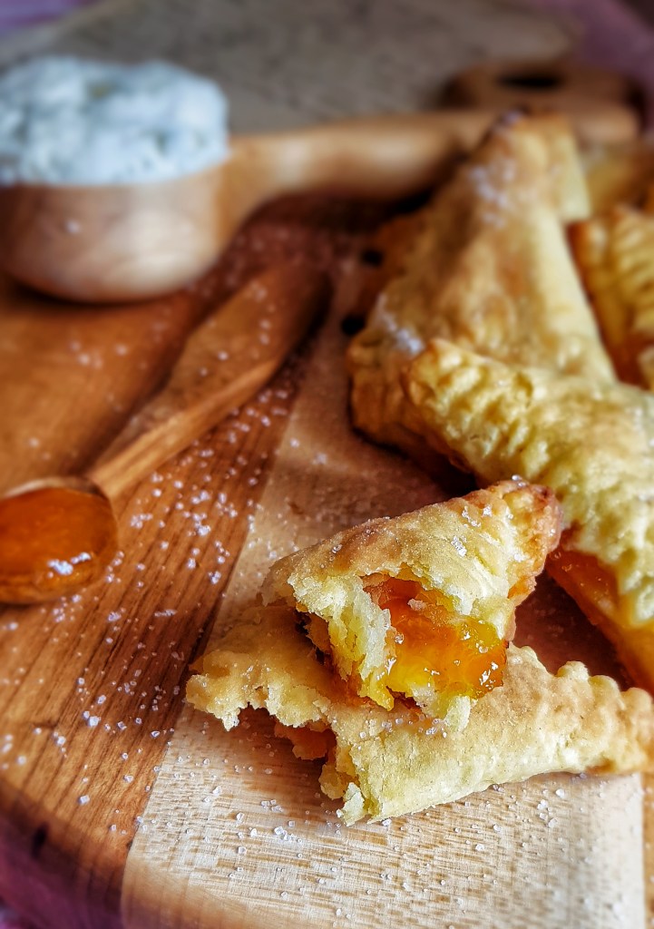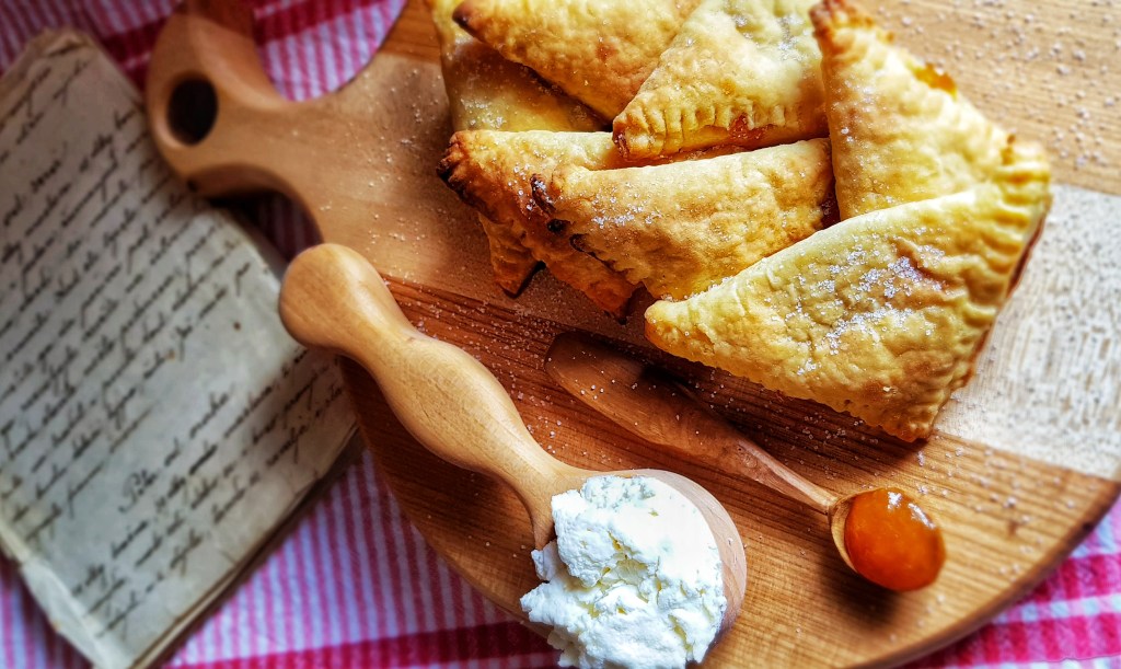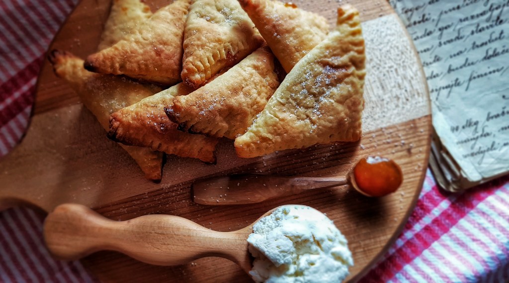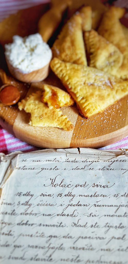 Na ove rustikalne, slatke trokute sam danas opako opekla jezik jer nisam mogla dočekati da se malo ohlade. Punjeni su domaćim pekmezom od marelica (teglicu sam sakrila u smočnicu još prošle sezone da imam baš za ovakve situacije). Predivan starinski kolač od tijesta koje se priprema sa svježim sirom i maslacem. Sir je također domaći, goranski. Okus i miris im je božanski, poput onih trokuta iz pekarnice, samo još bolji. Recept je zapisan krasopisom na istrgnutom listu papira i umetnut u bilježnicu sa starim receptima, no izgleda i djeluje stariji od ostalih. Što više proučavam ove stare recepte, sve više me oduševljavaju. Odmah vam napominjem, napravite duplu dozu jer ovi slatki trokuti će vam nestati u trenu.