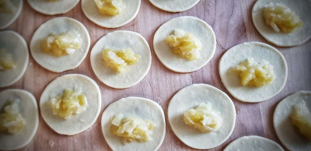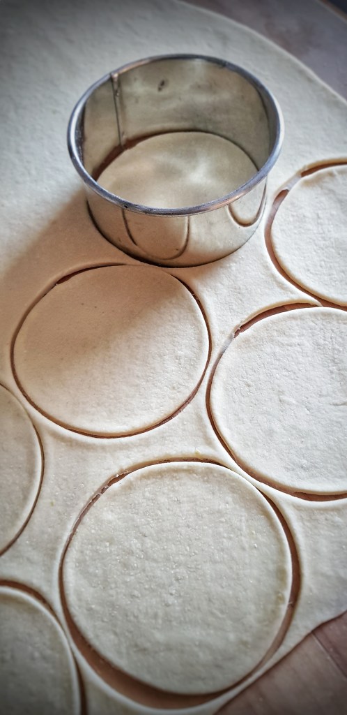 Dasku pobrašnite, premjestite tijesto na dasku pa ga tanko razvaljajte. Rezačem ili čašom režite krugove koje napunite nadjevom po želji. Rubove tijesta premažite umućenim bjelanjkom te preklopite da dobijete polumjesece i zatvorite nadjev. Vilicom pritisnite rubove kako nadjev ne bi curio, dobit ćete ukrasni rub.