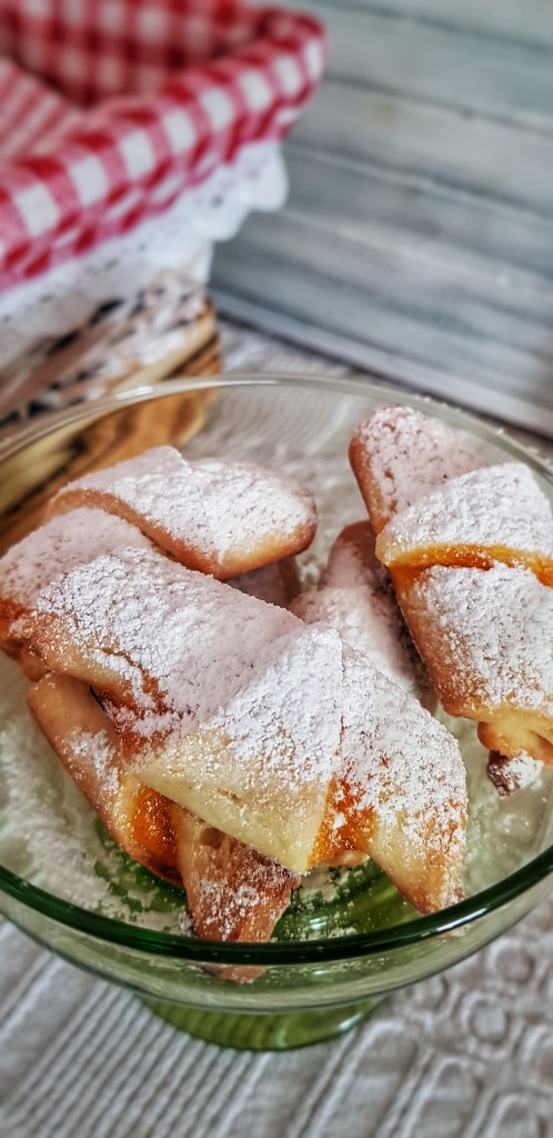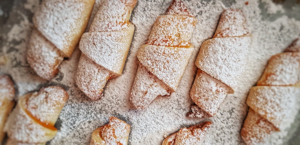 Bila sam u nedoumici koje brašno staviti pošto se ne navodi glatko ili oštro pa sam stavila oštro. Također, piše da je jedan od sastojaka “germa za 3 dinara”, a nisam uspjela saznati kolika je to količina kvasca pa sam stavila vrećicu suhog kvasca. Ove kiflice su ispale prhke, mirisne i tope se u ustima. Tijesto je poput tijesta za prhke pite i nije lako smotati kiflice pa nisu baš fotogenične, ali sve nadoknađuju okusom. Idući put ću probati s glatkim brašnom i punjenjem od maka pa ću vidjeti razliku.